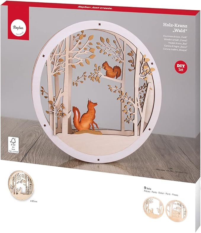 Dřevěná skládačka od značky Rayher pro vytvoření originální přírodní dekorace. V balení najdete laserem vyřezaný kulatý věnec s krásnými detaily. Díly jsou vyřezané z kvalitní FSC certifikované dýhy a snadno se do sebe zasouvají. Sestavením získáte 3D dekoraci na zeď.