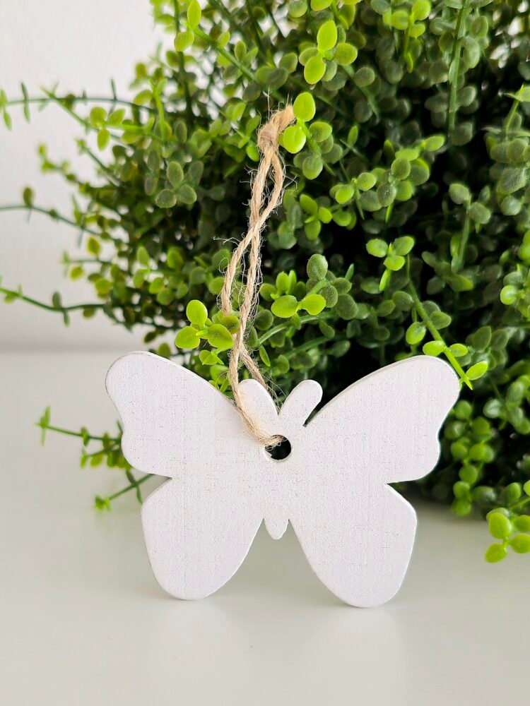 Dekorativní dřevěný motýlek v bílé barvě je milým doplňkem pro jarní i celoroční výzdobu. Díky provázku jej můžete snadno zavěsit na větvičky ve váze, na věnec, do aranžmá nebo jej použít jako drobnou ozdobu při balení dárků.