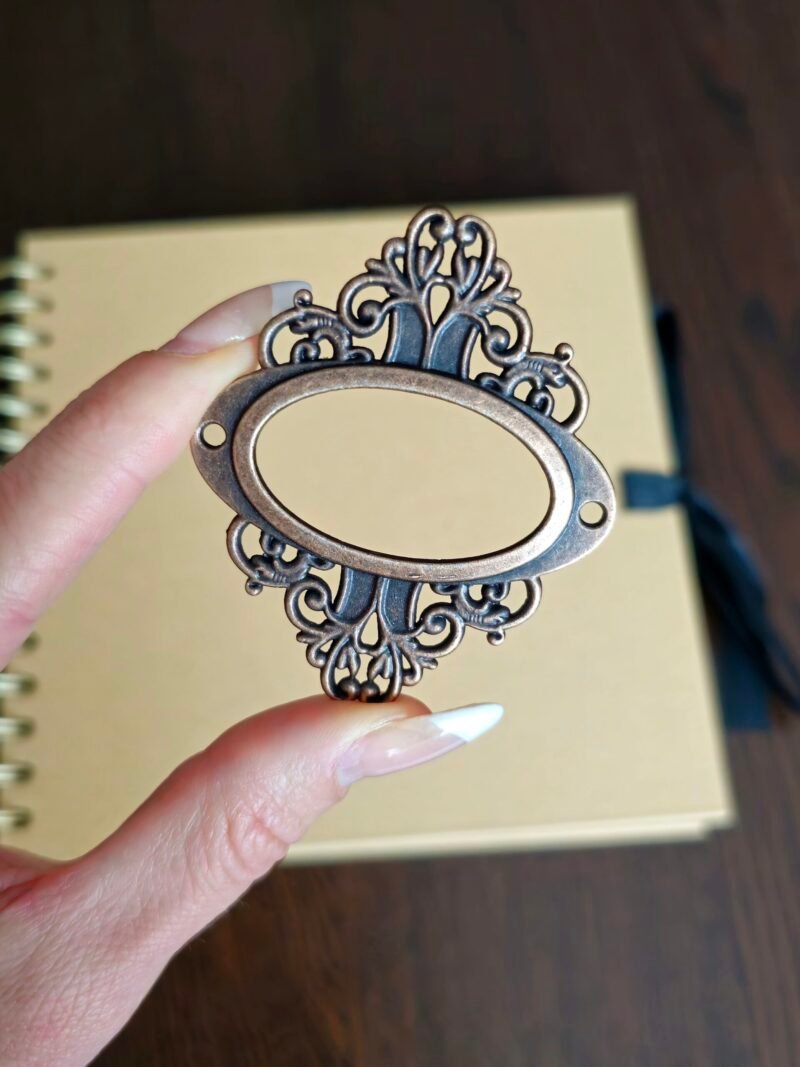 Tento kovový rámeček patří mezi oblíbené scrapbooking kovové doplňky. Zdobený okraj a bronzová barva se hodí zejména pro vintage, retro a elegantní styl projektů.
