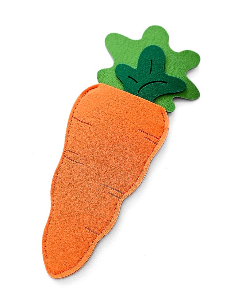 Filcová kapsa ve tvaru mrkve je hravá jarní dekorace, která se skvěle hodí na drobnou velikonoční nadílku nebo jako součást sváteční výzdoby. Díky praktické kapse můžete dovnitř schovat malé sladkosti, vajíčka nebo drobné překvapení pro děti.
