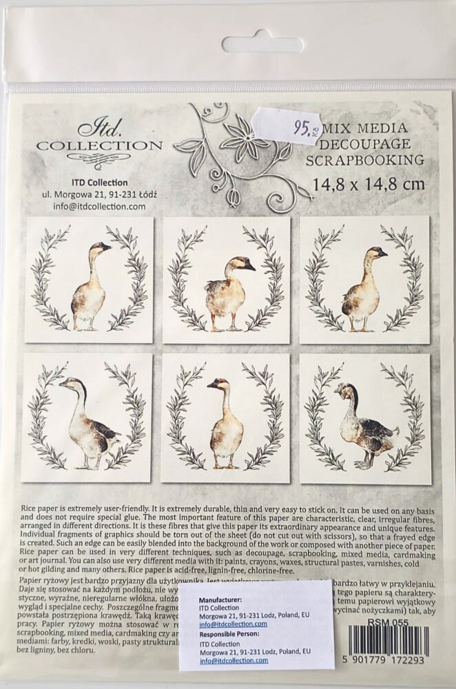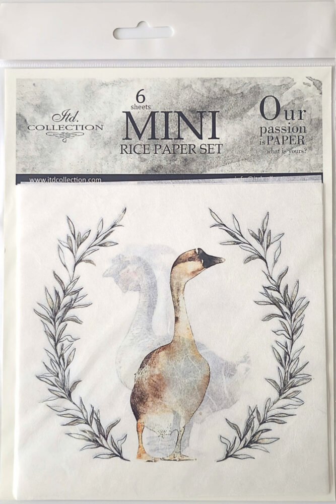 Sada dekorativních rýžových papírů s venkovským motivem kachny doplněným o jemnou vavřínovou snítku je určena pro kreativní techniky, jako jsou decoupage, scrapbooking a mixed media. Čtvercový formát 14,8 × 14,8 cm je praktický pro zdobení čtvercových dekorací i detailních kompozic. Balení obsahuje 6 kusů papírů s motivem v rustikálním stylu, který se dobře hodí do velikonočních nebo venkovských dekorací.