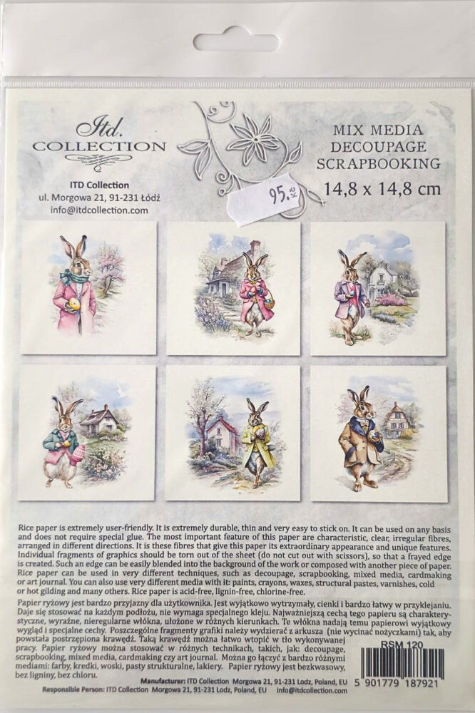 Dekorativní rýžové papíry velikonoční zajíčci pro různé kreativní techniky, zejména decoupage, scrapbooking a mixed media. Motiv inspirovaný venkovským prostředím se skvěle hodí pro velikonoční tvoření, jarní dekorace i projekty v rustikálním stylu. Balení obsahuje 6 listů o rozměru 14,8 × 14,8 cm.