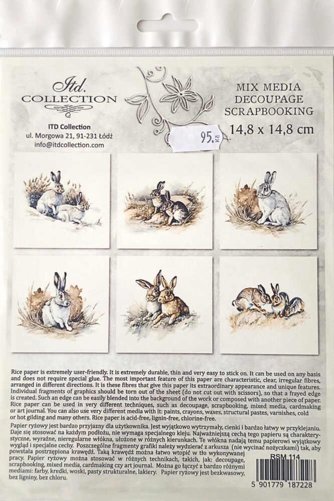 Dekorativní rýžové papíry králíčci a zajíčci pro různé kreativní techniky, zejména decoupage, scrapbooking a mixed media. Motiv inspirovaný venkovským prostředím se skvěle hodí pro velikonoční tvoření, jarní dekorace i projekty v rustikálním stylu. Balení obsahuje 6 listů o rozměru 14,8 × 14,8 cm.
