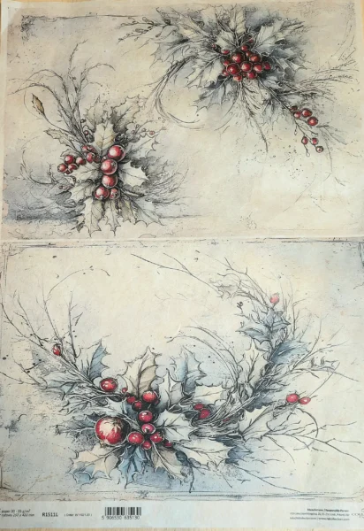 Rýžový papír se zimním motivem zimostrázu na kreativní tvoření doma, například na decoupage, mixed media, scarpbooking a další. Tento papír se díky přírodnímu původu ideálně přizpůsobí různým tvarům povrchů, je vhodný pro hrany, rovné o zakřivené tvary, na dřevo, sklo, keramiku, papír, karton, svíčky a další.