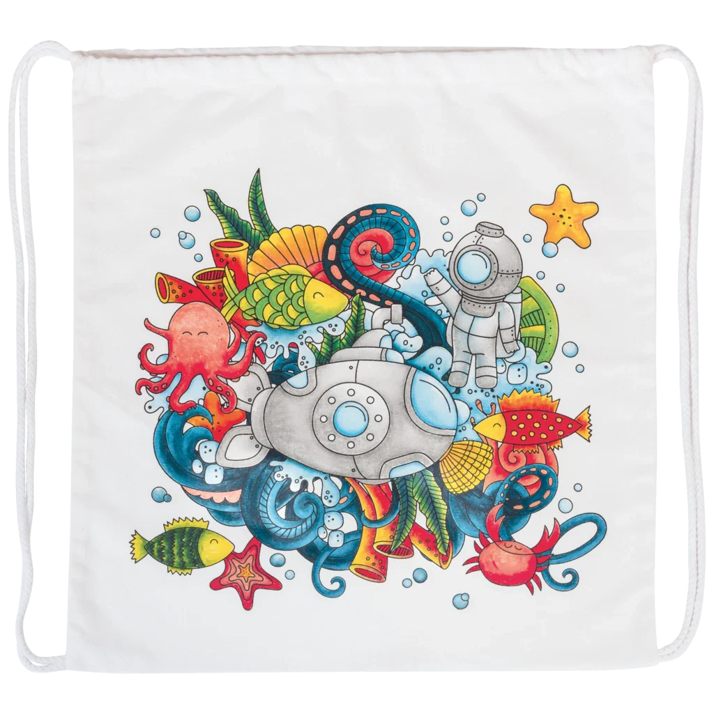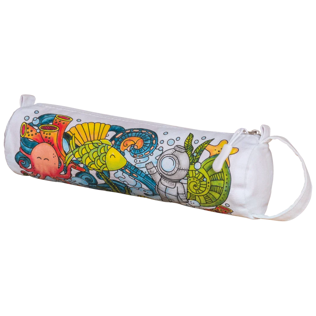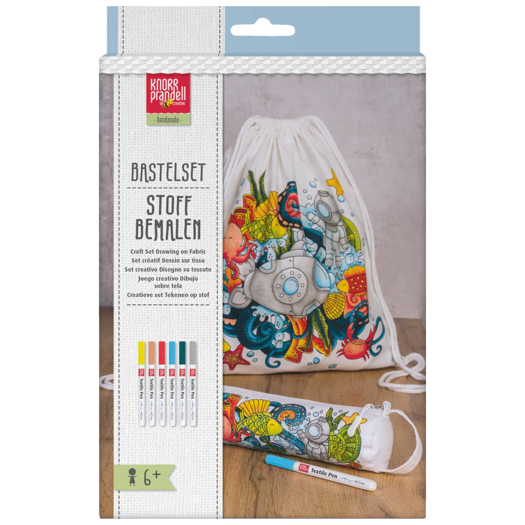 Tato originální sada na téma mořský svět a ponorka nabízí vše potřebné k tomu, aby si děti i dospělí vytvořili vlastní barevné doplňky na míru. V sadě najdete látkový batoh a pouzdro na fixy ze světlého kvalitního plátna, připraveného k malování a k tomu 6 kusů speciálních fixů na textil.