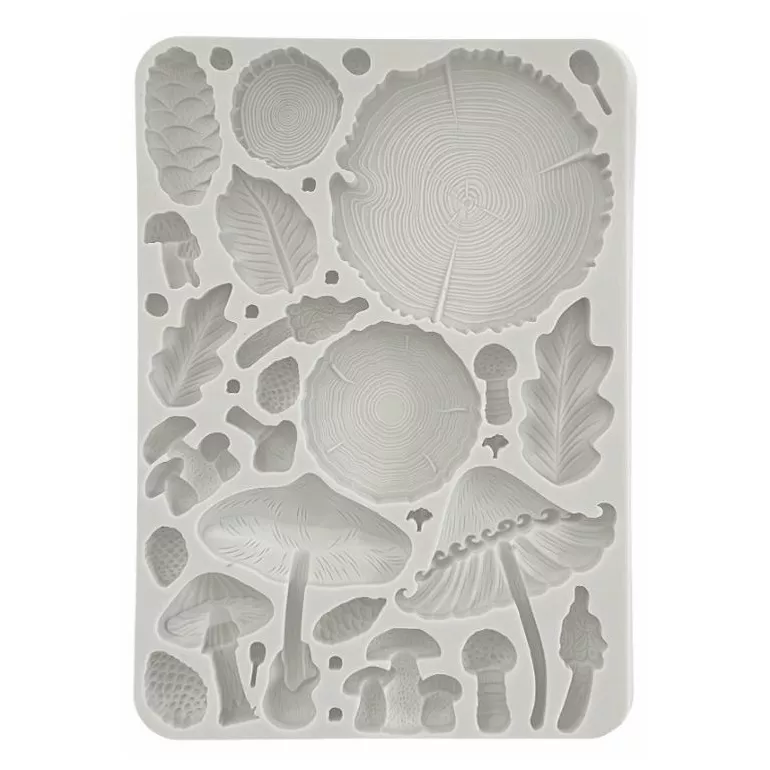 Flexibilní silikonová forma Stamperia – dřevo, listy a houby v lese je ideální pro všechny kreativní projekty s odléváním. Díky měkkému a pružnému materiálu snadno vytvoříte přesné odlitky různých materiálů, jako jsou pryskyřice, mýdlová hmota, sádra, FIMO, beton nebo jiné samotvrdnoucí hmoty.