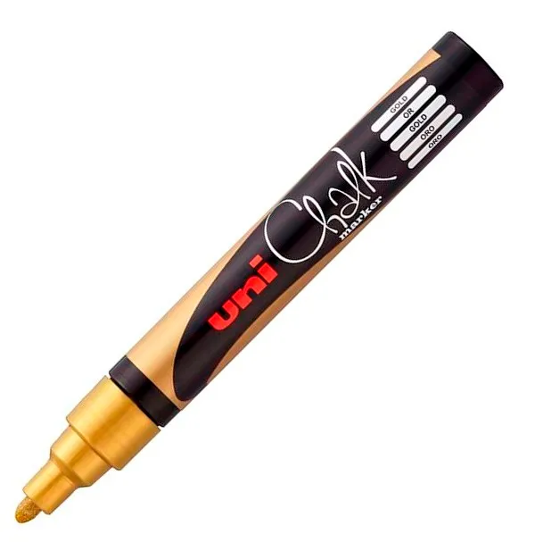 Křídový popisovač Uni Chalk Marker je ideální pro psaní, kreslení i dekorativní nápisy na hladké neporézní povrchy. Vytváří výrazné, syté zlaté tahy, které jsou dobře čitelné a působí profesionálně.