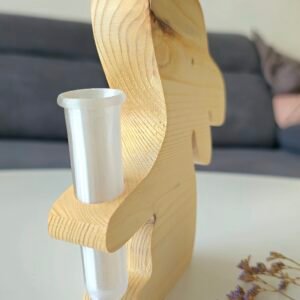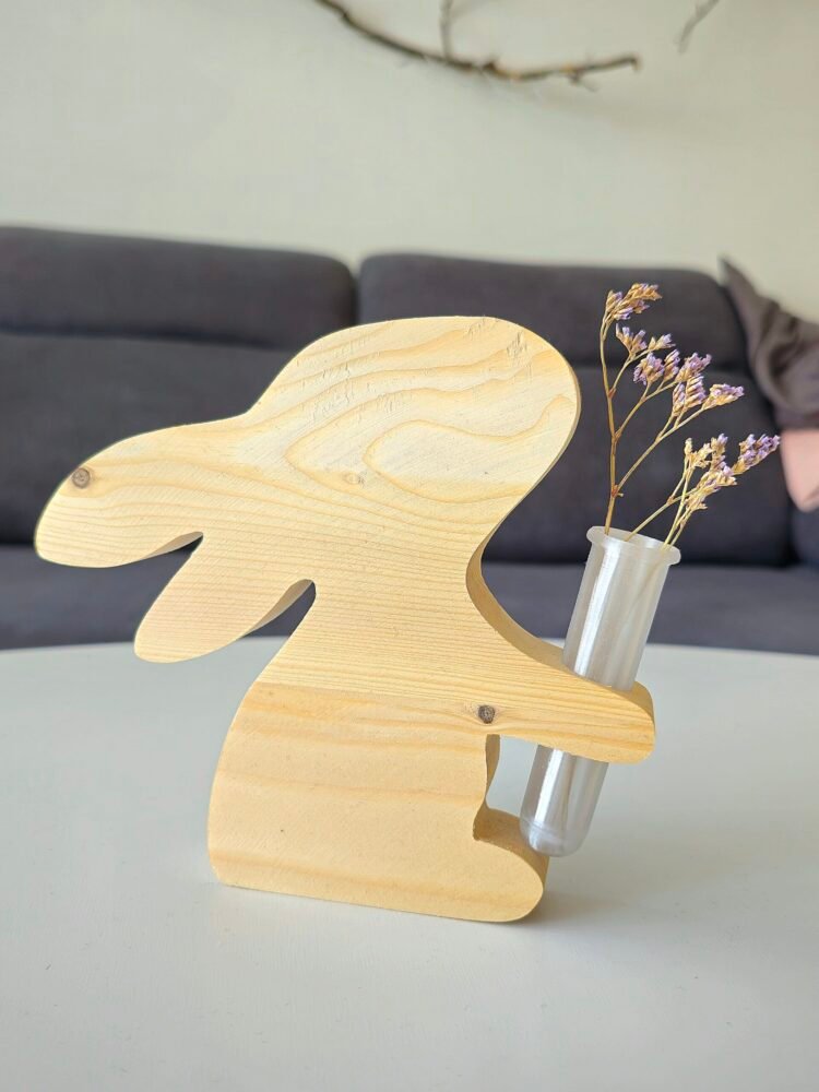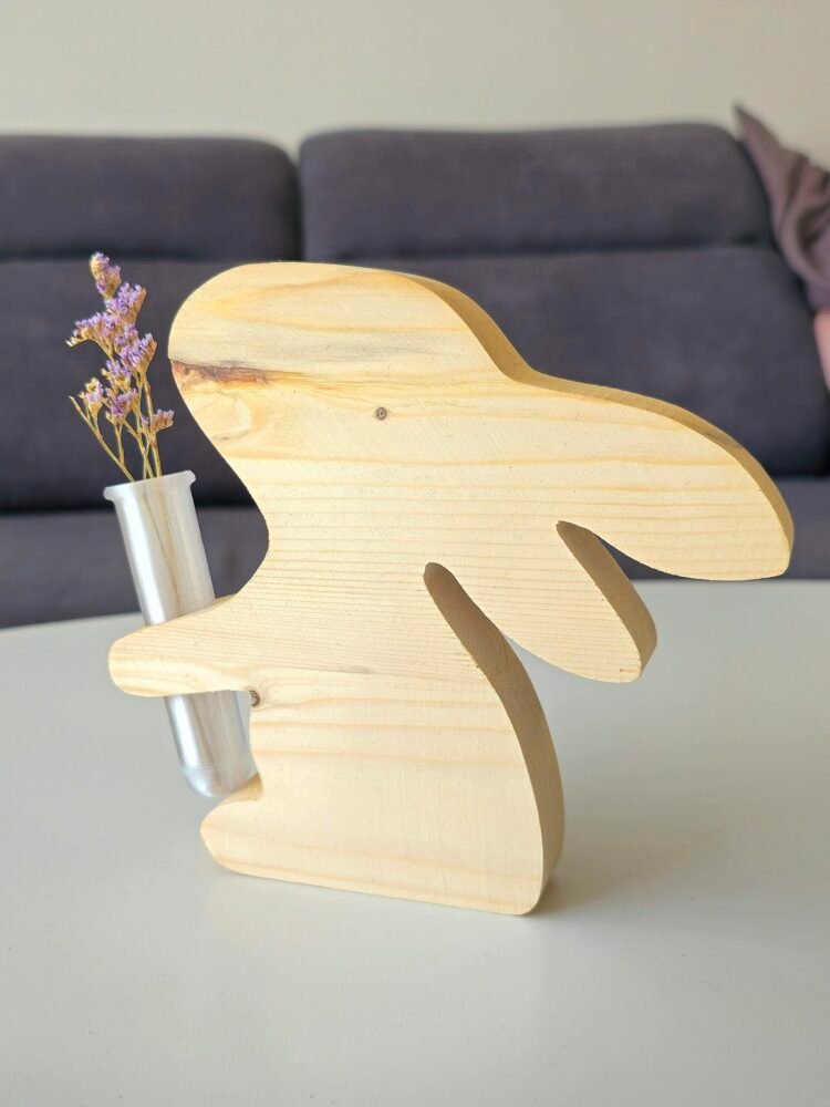 Zajíček o velikosti cca 16 cm (výška) × 17,5 cm (délka) × 2,6 cm (síla) je vyroben ze dřeva a díky své stabilní tloušťce pevně stojí, takže se hodí jako dekorace na stůl, komodu i parapet. V tlapičkách svírá plastovou vázičku, do které můžete vložit čerstvé jarní kvítí, sušené květy, kočičky, větvičky nebo drobnou velikonoční dekoraci.